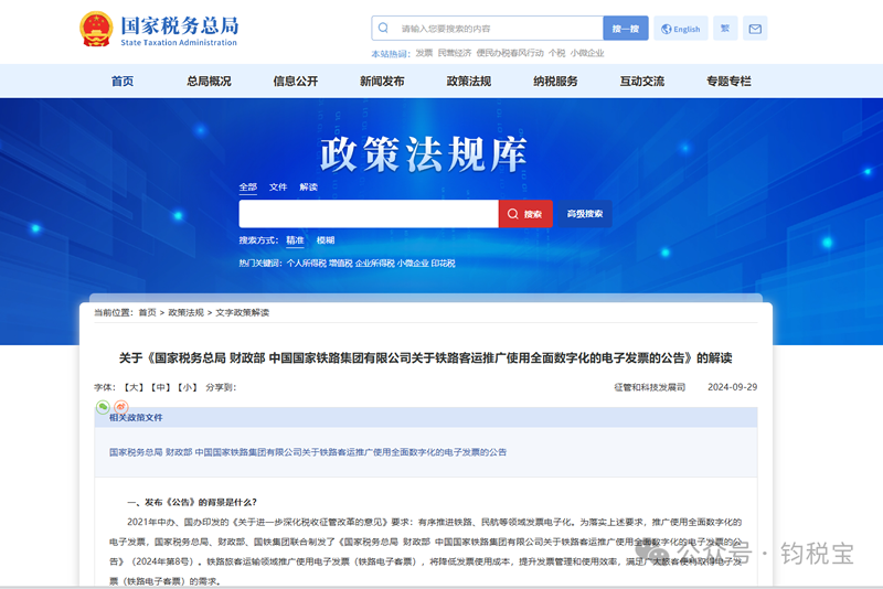 关于《国家税务总局 财政部 中国国家铁路集团有限公司关于铁路客运推广使用全面数字化的电子发票的公告》的解读