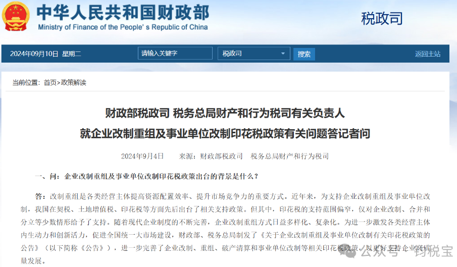 一、问:企业改制重组及事业单位改制印花税政策出台的背景是什么?答:改制重组是各类经营主体提高资源配置效率、提升市场竞争力的重要方式。近年来,为支持企业改制重组及事业单位改制,我国在契税、土地增值税、印花税等方面先后出台了相关支持政策。但其中,印花税的支持范围偏窄,仅对企业改制、合并和分立等少数情形给予了支持。随着现代企业制度的不断完善,企业改制重组方式日益多样化、复杂化。为进一步激发各类经营主体内生动力和创新活力,促进全国统一大市场建设,财政部、税务总局制发了《关于企业改制重组及事业单位改制有关印花税政策的公告》(以下简称《公告》),进一步完善了企业改制、重组、破产清算和事业单位改制等相关印花税政策,以更好支持企业高质量发展。二、问:这次完善企业改制重组及事业单位改制印花税政策主要考虑有哪些?